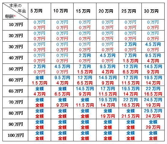 ということで、報酬(正しくは上記『総報酬月額相当額』)と本来の年金(正しくは老齢厚生年金)による年金カット額は次のようになる。最上段の横軸は、本来の年金額だ。