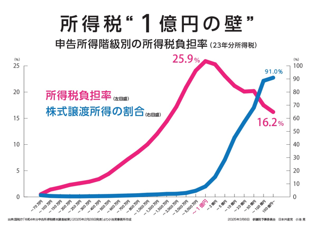 右のタテ軸が、株式譲渡所得の割合を示すが、見ての通り、総所得が1億円に満たないあたりでは株式譲渡所得の割合が数%に過ぎない。これが1億円を超えると急上昇して、所得100億円では株式譲渡所得が9割を超えている。