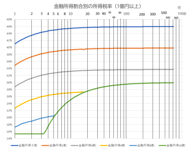 まずは現状、金融所得の割合が一定の方で比較すると、総合所得が数億円を超える場合はほとんど個人の税率に変化はなく、税率の変化はほぼ金融所得の割合だけに依存する。