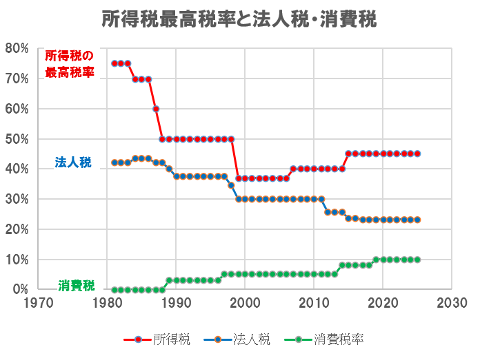 所得税の最高税率は元々1983年まで10年間75%もあったが、消費税の導入・増税に伴って徐々に削減されてきた。